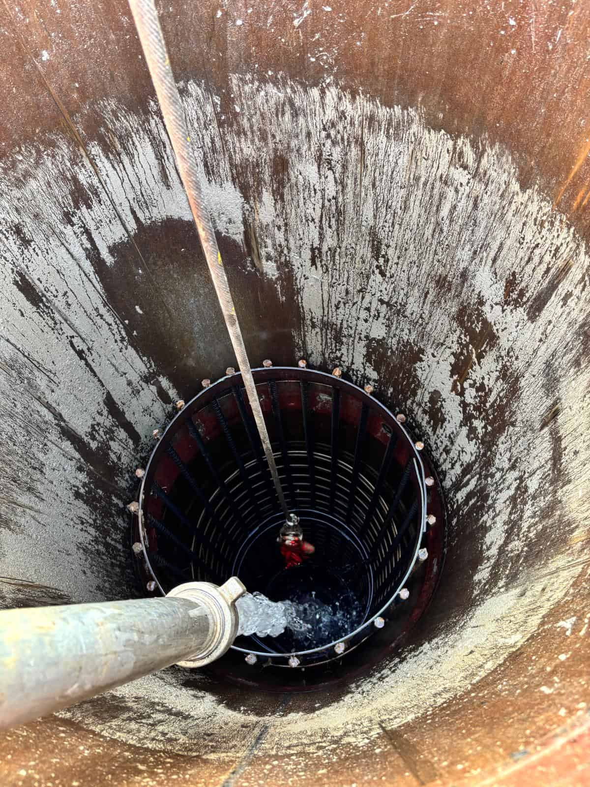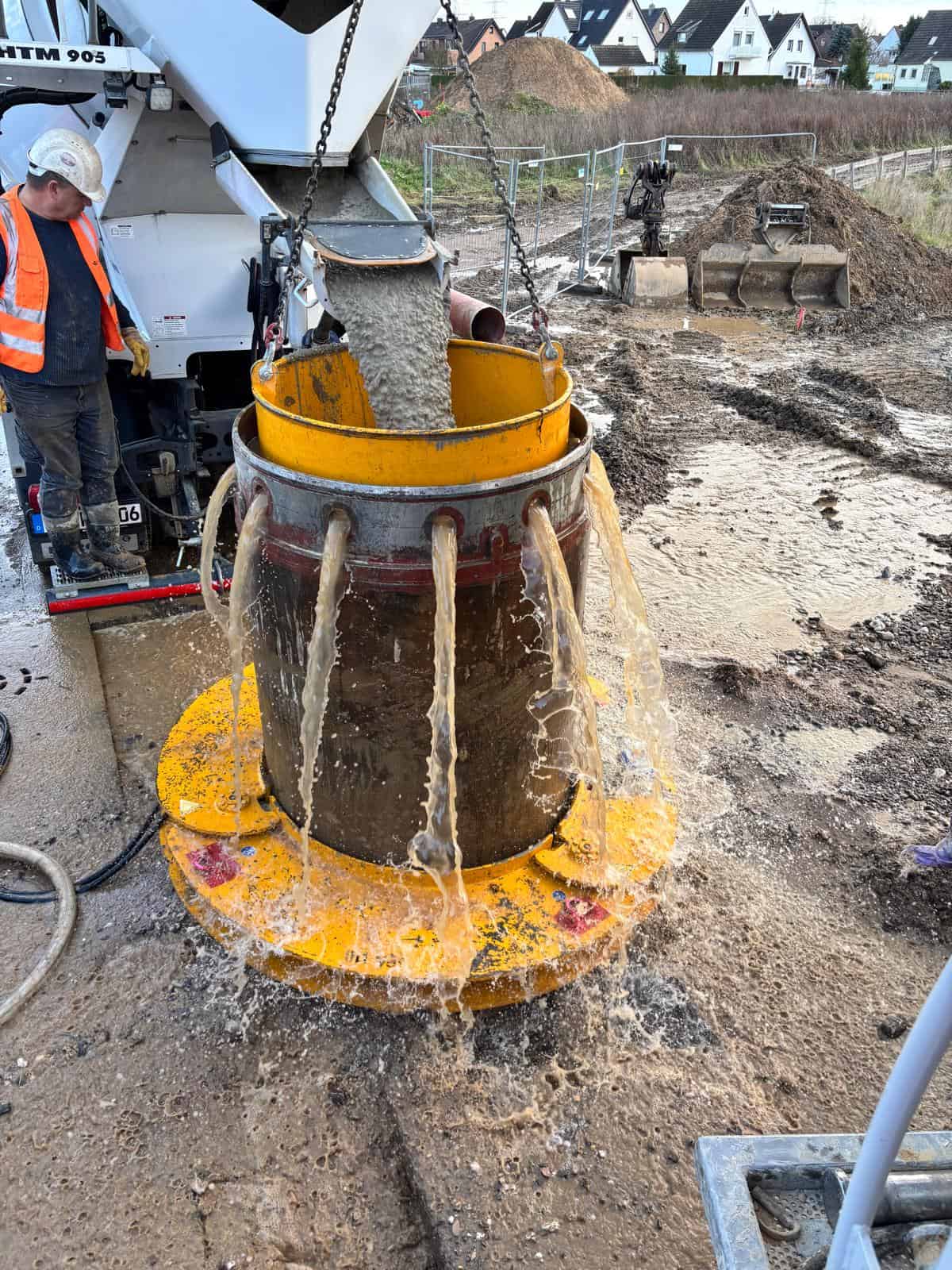 Anschließend erfolgt die Betonage des Bohrpfahls mit rund 24 m³ Beton, wobei der Frischbeton das Wasser kontrolliert nach oben verdrängt. Während der Betonage wird die Bohrhülse stufenweise gezogen, um eine gleichmäßige Verfüllung sicherzustellen. Abschließend sind die fertigen Bohrpfähle für das Widerlager zu sehen, die als tragende Elemente der Gründung dienen.